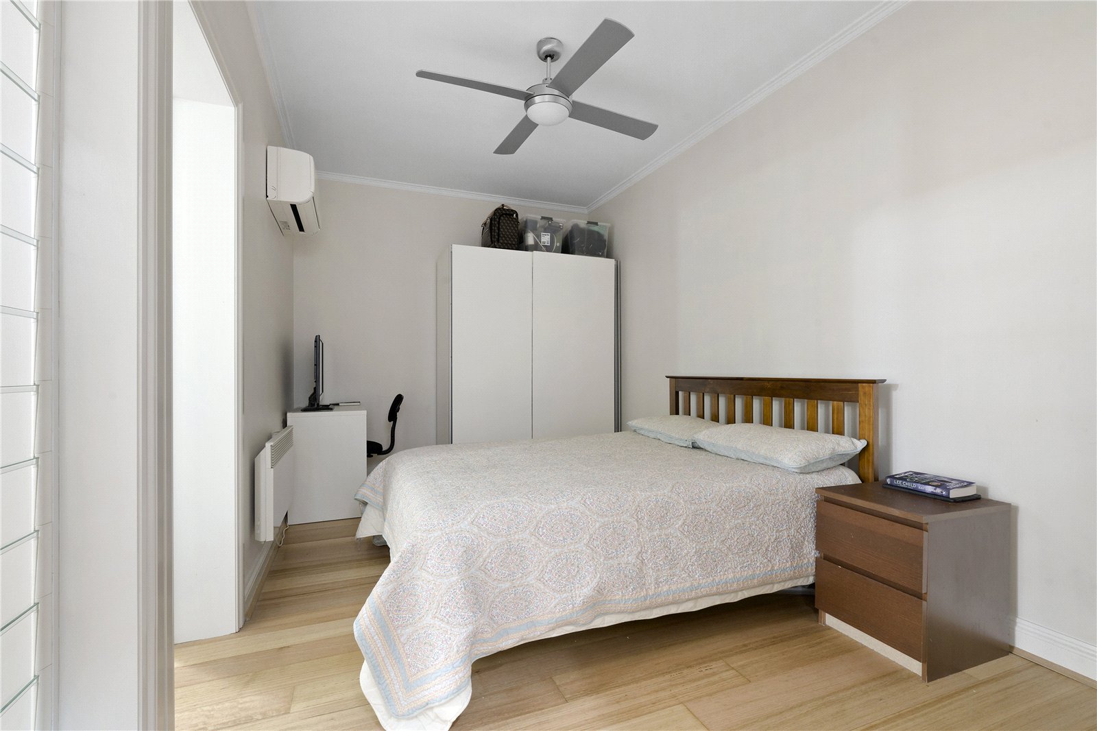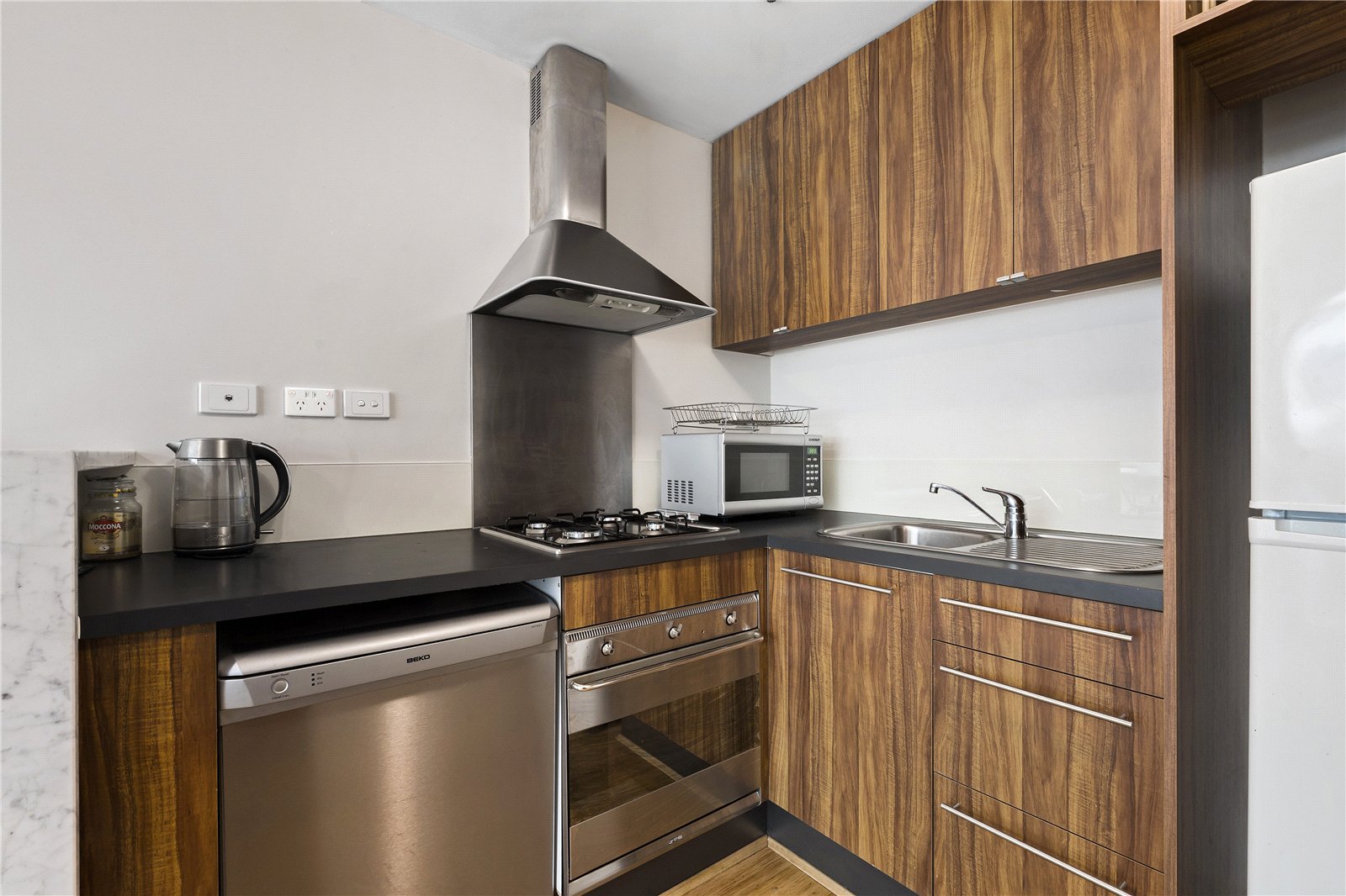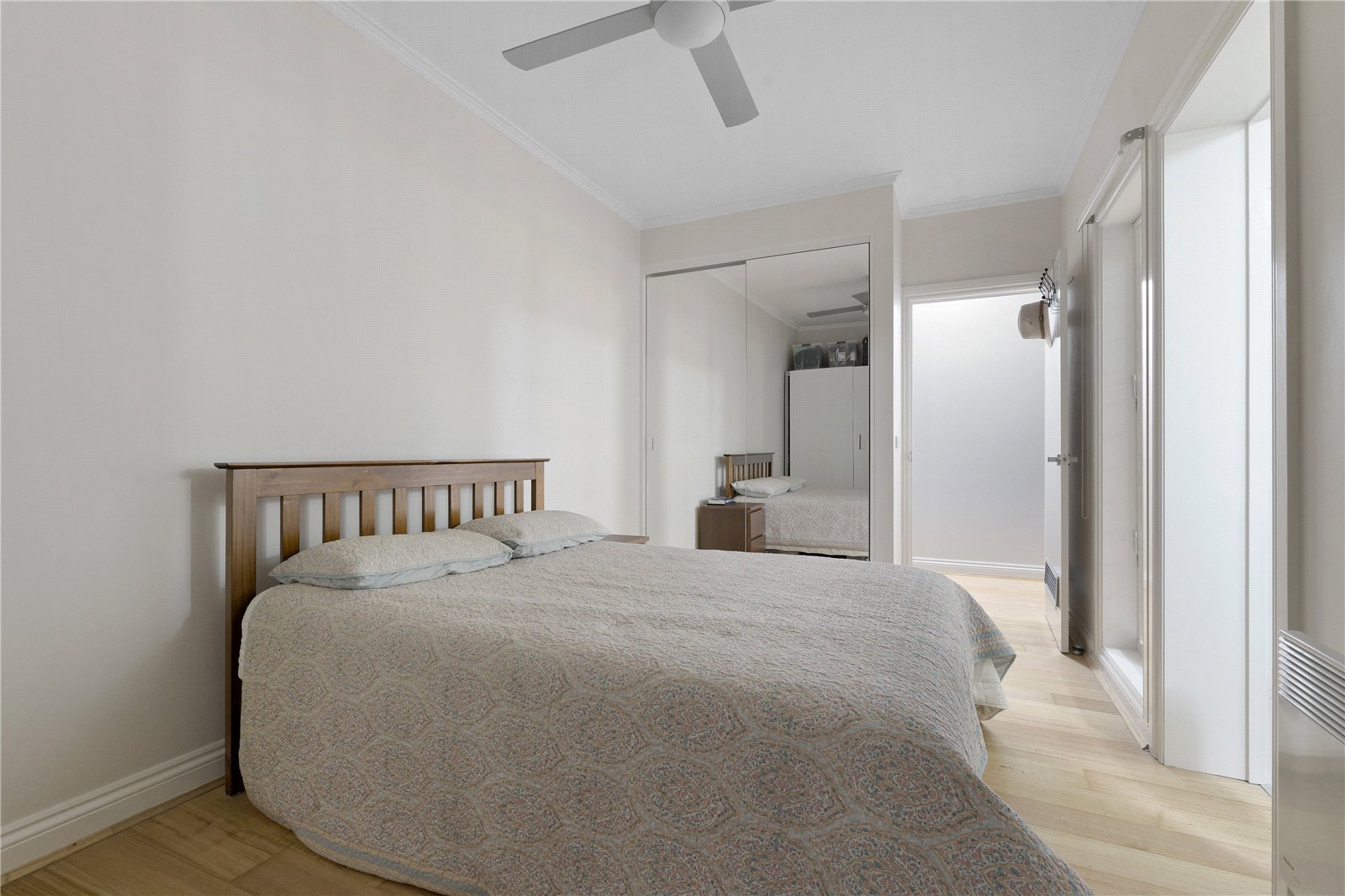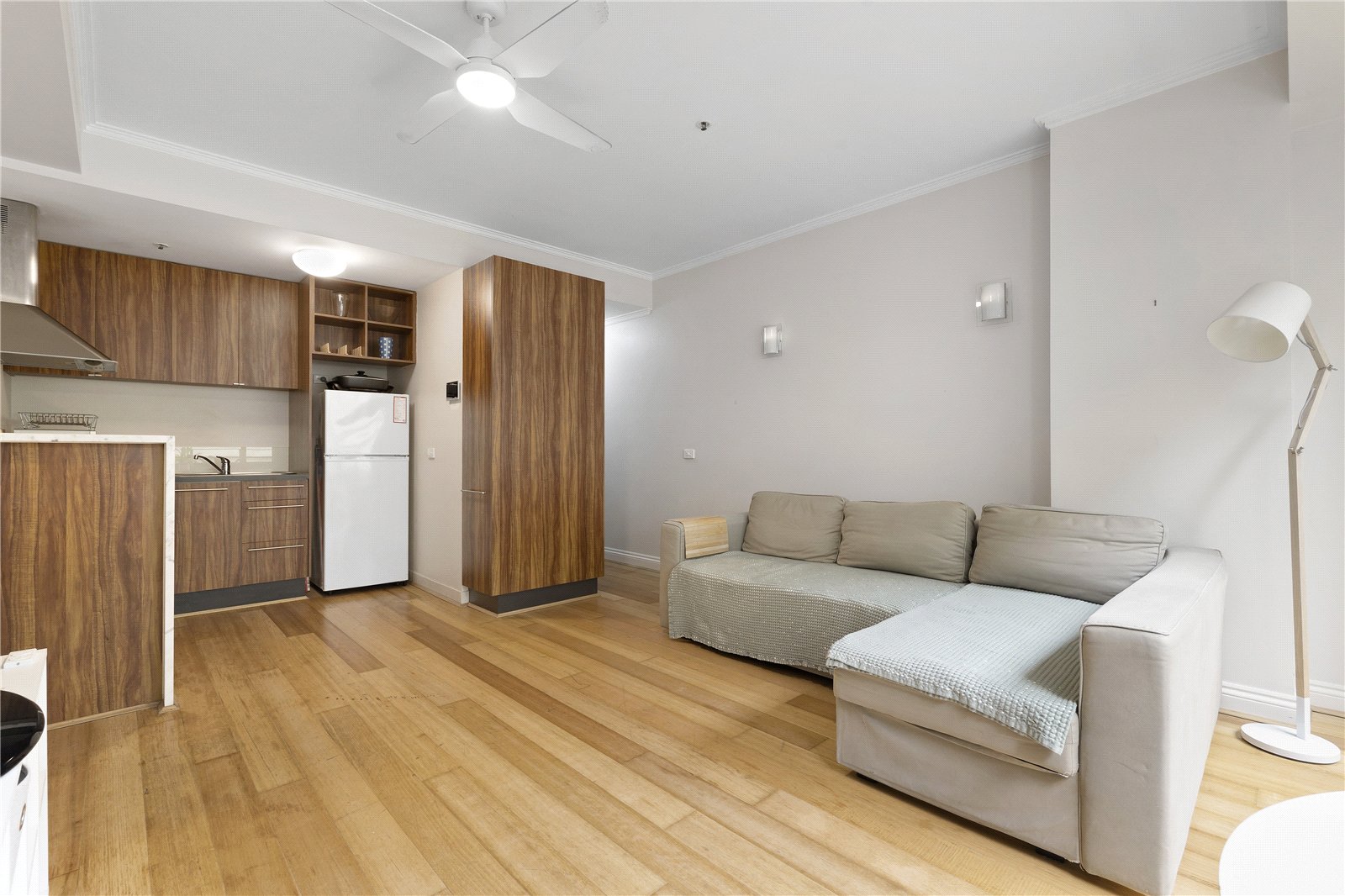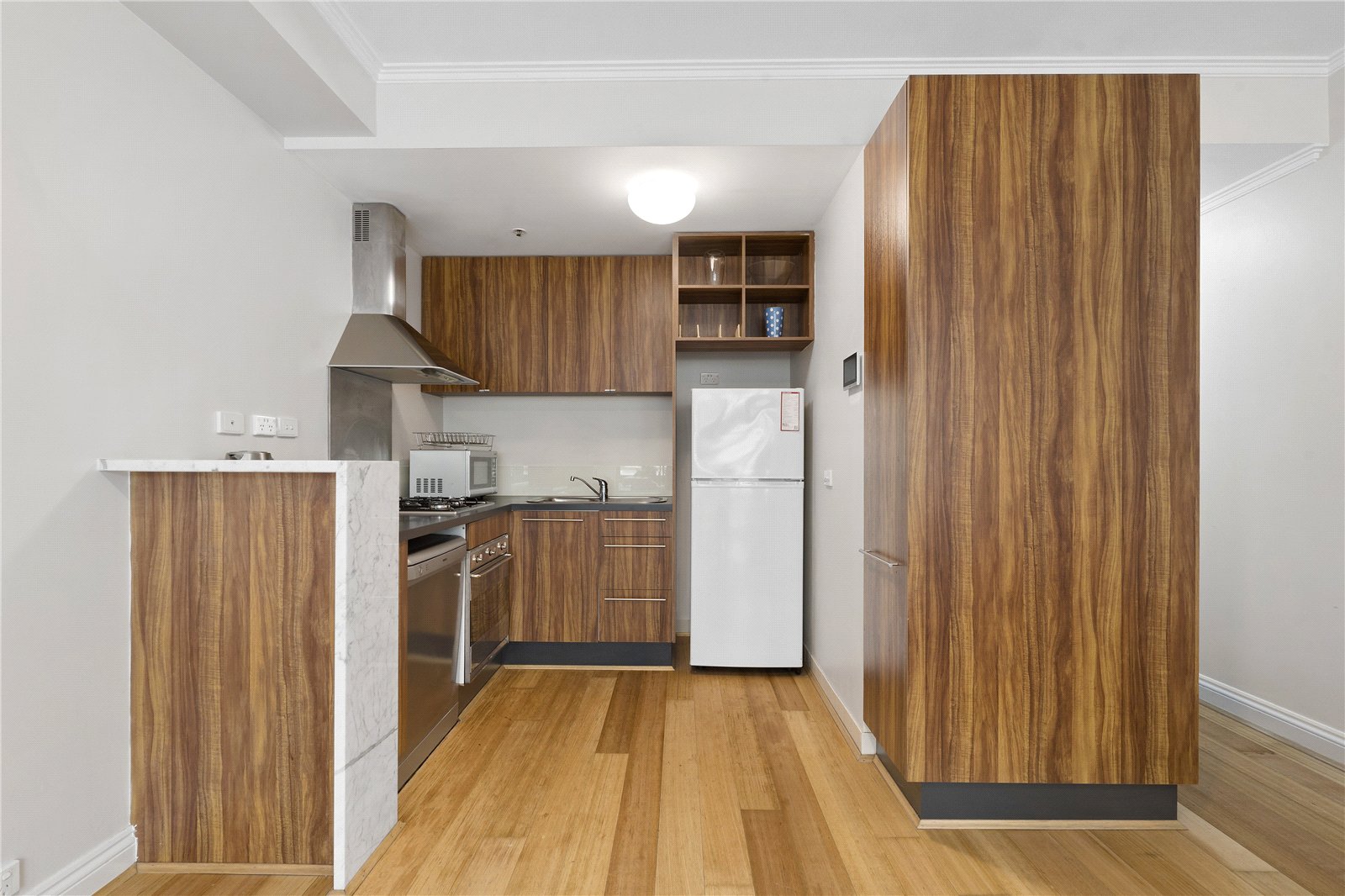 Discover roomy open-plan living and dining on lightly toned floorboards, complemented by an L-shaped kitchen boasting a Smeg oven, a 4-burner gas cooktop, and an updated dishwasher. Elevated to perfection on the fourth floor, oversized picture windows attract northern light with ease. The large, air-conditioned bedroom is serviced by mirrored built-in robes, additional heating, a ceiling fan, and a dual-access bathroom with marble finishing.