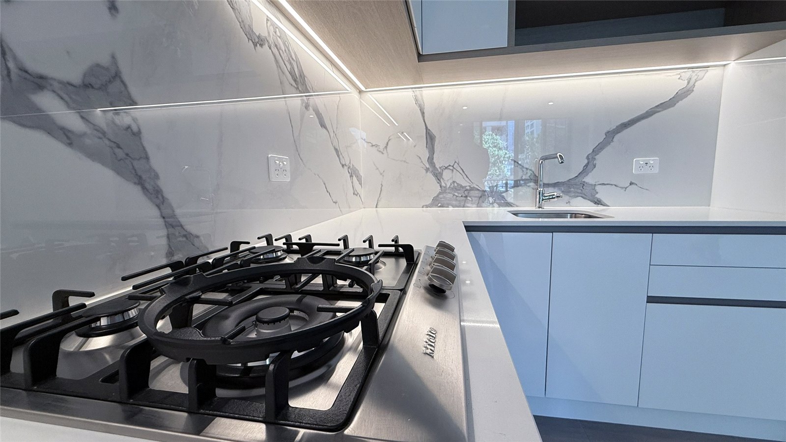 Sophisticated Kitchen: Featuring high-quality benchtops, premium appliances (including an integrated dishwasher), and a striking splashback.